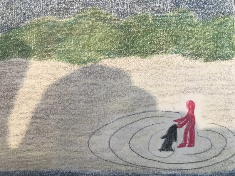“Ligt je toga nog in je koffer?” vraagt hij. Zij antwoordde:” ja, natuurlijk, ik heb de kinderen opgehaald van school en zag plotseling een rode bus die ik als een idioot ben gaan volgen. “Zo idioot vind ik dat niet,” zei hij, en opende haar koffer. Hij haalde de toga eruit en gaf hem aan haar. “Trek hem aan”, beval hij haar, en ze gehoorzaamde alsof het de gewoonste zaak van de wereld was om, in de avondschemering op het strand van Monster, een toga over haar naakte lijf te dragen. ”Kom” zei hij, “volg me naar de Weg van de Waarheid van het Leven.” Hij leidde haar naar zijn tekening aan de vloedlijn. Vaag herkende ze het beeld van lijnen.”Dit is een labyrint” zei hij plechtig.Al eeuwenlang wordt het labyrint gebruikt om inzicht te krijgen. Het is geen doolhof, je kunt niet verdwalen. Je loopt de weg die voor je ligt, je wendt en keert totdat je in het middelpunt komt. Dan ga je terug. Je loopt met je levensvraag door het labyrint en hoopt het antwoord te vinden.” Terwijl hij naast het labyrint in het zand ging zitten, ging zij het labyrint binnen. Ze liep naar rechts, draaide om en volgde de lijnen in het zand. Soms liep ze richting zee, die steeds donkerder werd, soms liep ze in de richting van de duinen. Ze liep langzaam, meditatief zou je kunnen zeggen, haar weg. Haar zwarte toga sleepte door het zand en wiste haar voetafdrukken uit. Het leek uren te duren voordat ze in het midden van het labyrint kwam. Ze keek naar de inktzwarte zee. Angst overviel haar, ze werd aangetrokken door het zwart, ze wilde erin verdwijnen, oplossen, niets meer voelen, niets meer weten, niets meer zijn. Toen zag ze een zilveren glinstering die steeds helderder werd.Ze bleef staan, ontroerd door het zachte schijnsel op het water. Het zilver speelde een spel met de golven, het leek alsof het zwart week voor het licht, alsof het licht overwon! Met een ruk trok ze de toga over haar hoofd en gooide hem in het zand.Ze realiseerde zich dat zwart haar niet alleen beschermde tegen de boze buitenwereld, maar dat het zwart ook haar gevoel afschermt, zodat ze niet meer in contact kan komen met zichzelf, met haar binnenwereld, met haar doel, haar weg, haar waarheid en haar leven. Terwijl de tranen over haar wangen liepen draaide ze zich om om de terugweg door het labyrint te aanvaarden. Door haar tranen heen zag ze de maan, de volle maan. Zij, die de zilveren glinstering op de zee had veroorzaakt. De maan die met haar reflectie haar had laten ontwaken uit de zwarte nacht. Haar schijnsel verlichtte haar naakte lichaam, haar rondingen, haar welvingen. De man pakte haar hand toen ze uit het labyrint liep. Zacht vleide ze zich tegen hem aan. “Wat ben je mooi”, fluisterde hij in haar oor en hij streelde haar haren. Zijn handen gleden over haar lichaam en ze was vervuld van intens genot. Hij streelde haar rug, omvatte haar billen met zijn volle hand en plaagde haar door kriebelend met zijn wijsvinger langs haar bilnaad te gaan. Liefdevol betasten zijn lippen haar tepels en zijn mond zocht de welving van haar vulva.